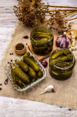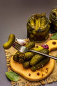 Marynowane ogórki marynowane z przyprawami i ziołami. Tradycyjna domowej roboty fermentowana przystawka w glinianej misce. Stary drewniany stół, zbliżenie
