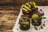 Zdjęcie "Marynowane ogórki marynowane z przyprawami i ziołami. Tradycyjna domowej roboty fermentowana przystawka w glinianej misce. Stary drewniany stół, zbliżenie" może być wykorzystywane do celów osobistych i komercyjnych zgodnie z warunkami zakupionej licencji Royalty-free. Obraz jest dostępny do pobrania w jakości wysokiej rozdzielczości do 5760x3840.