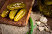 Zdjęcie "Marynowane ogórki marynowane z przyprawami i ziołami. Tradycyjna domowej roboty fermentowana przystawka w glinianej misce. Stary drewniany stół, zbliżenie" może być wykorzystywane do celów osobistych i komercyjnych zgodnie z warunkami zakupionej licencji Royalty-free. Obraz jest dostępny do pobrania w jakości wysokiej rozdzielczości do 5760x3840.