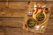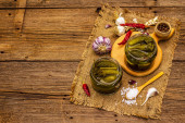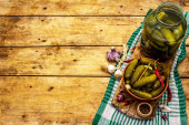 Marynowane ogórki marynowane z przyprawami i ziołami. Tradycyjna domowej roboty fermentowana przystawka w glinianej misce. Stary drewniany stół, przestrzeń do kopiowania