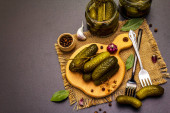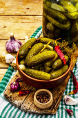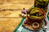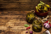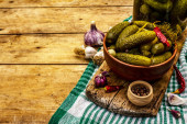 Marynowane ogórki marynowane z przyprawami i ziołami. Tradycyjna domowej roboty fermentowana przystawka w glinianej misce. Stary drewniany stół, widok z góry
