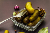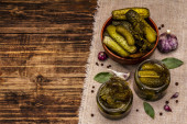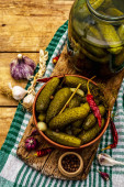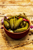 Marynowane ogórki marynowane z przyprawami i ziołami. Tradycyjna domowej roboty fermentowana przystawka w glinianej misce. Stary drewniany stół, widok z góry