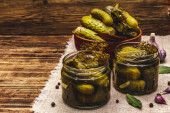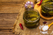 Zdjęcie "Marynowane ogórki marynowane z przyprawami i ziołami. Tradycyjna noworoczna przystawka w szklanych słoikach i kryształowej płycie. Białe drewniane deski tło, widok z góry" może być wykorzystywane do celów osobistych i komercyjnych zgodnie z warunkami zakupionej licencji Royalty-free. Obraz jest dostępny do pobrania w jakości wysokiej rozdzielczości do 5760x3840.