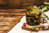 Marynowane ogórki marynowane z przyprawami i ziołami. Tradycyjna noworoczna przystawka w szklanych słoikach i kryształowej płycie. Białe drewniane deski tło, widok z góry