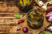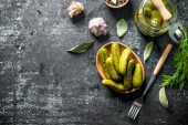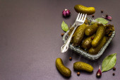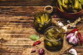 Zdjęcie "Marynowane ogórki marynowane z przyprawami i ziołami. Tradycyjna noworoczna przystawka w szklanych słoikach i kryształowej płycie. Białe drewniane deski tło, widok z góry" może być wykorzystywane do celów osobistych i komercyjnych zgodnie z warunkami zakupionej licencji Royalty-free. Obraz jest dostępny do pobrania w jakości wysokiej rozdzielczości do 5760x3840.