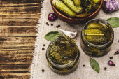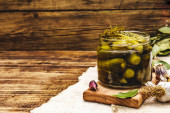 Zdjęcie "Marynowane ogórki marynowane z przyprawami i ziołami. Tradycyjna noworoczna przystawka w szklanych słoikach i kryształowej płycie. Białe drewniane deski tło, przestrzeń do kopiowania" może być wykorzystywane do celów osobistych i komercyjnych zgodnie z warunkami zakupionej licencji Royalty-free. Obraz jest dostępny do pobrania w jakości wysokiej rozdzielczości do 5760x3840.