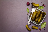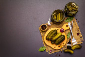 Marynowane ogórki marynowane z przyprawami i ziołami. Tradycyjna noworoczna przystawka w krystalicznym talerzu. Modne czarne kamienne tło betonowe, zbliżenie