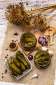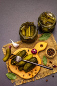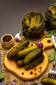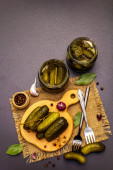 Marynowane ogórki marynowane z przyprawami i ziołami. Tradycyjna noworoczna przystawka w krystalicznym talerzu. Modne czarne kamienne tło betonowe, zbliżenie