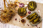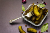 Zdjęcie "Marynowane ogórki marynowane z przyprawami i ziołami. Tradycyjna noworoczna przystawka w krystalicznym talerzu. Modne czarne kamienne tło betonowe, zbliżenie" może być wykorzystywane do celów osobistych i komercyjnych zgodnie z warunkami zakupionej licencji Royalty-free. Obraz jest dostępny do pobrania w jakości wysokiej rozdzielczości do 5760x3840.