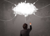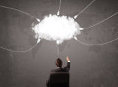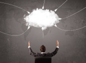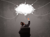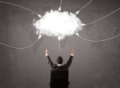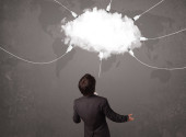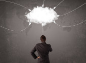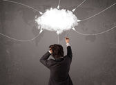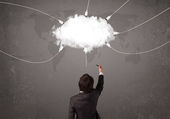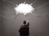 Biznes człowiek w garniturze patrząc na chmurę z spadających pieniędzy
