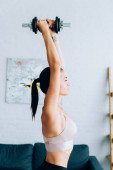 Trening młodych sportowców z różowymi hantlami w salonie