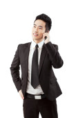 Biznesmen śmiejący się z pięściami w górze