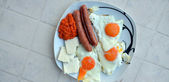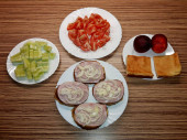 Ceramiczna płyta z bochenka mięsa, tłuczone ziemniaki, ogórek, cebula i marchewka, wszystko na obrusie z dominującym fioletowym motywem, obraz