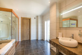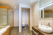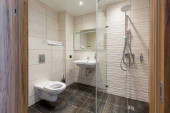Zdjęcie "Wnętrze łazienki hotelowej z kabiną prysznicową" może być wykorzystywane do celów osobistych i komercyjnych zgodnie z warunkami zakupionej licencji Royalty-free. Obraz jest dostępny do pobrania w jakości wysokiej rozdzielczości do 5760x3840.