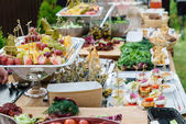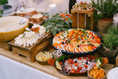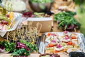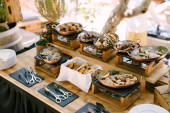 Kosz na stół z sałatkami, czystymi talerzami i kwiatami w doniczkach na rozmytym tle.