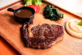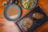 Stół z różnymi daniami, pieczona wołowina, sałatka i zupa. Inna karma na drewnianym stole. Trzy menu dań