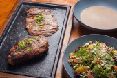 Zdjęcie "Stół z różnymi daniami, pieczona wołowina, sałatka i zupa. Inna karma na drewnianym stole. Trzy menu dań" może być wykorzystywane do celów osobistych i komercyjnych zgodnie z warunkami zakupionej licencji Royalty-free. Obraz jest dostępny do pobrania w jakości wysokiej rozdzielczości do 5760x3840.