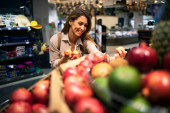Zdjęcie "Pozytywna brunetka trzymająca kokosa w dziale owoców. Zakup owoców w supermarkecie." może być wykorzystywane do celów osobistych i komercyjnych zgodnie z warunkami zakupionej licencji Royalty-free. Obraz jest dostępny do pobrania w jakości wysokiej rozdzielczości do 5760x3840.