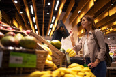 Kobieta kupująca jedzenie w supermarkecie. Zakupy spożywcze.