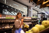 Zdjęcie "Kobieta kupująca jedzenie w supermarkecie. Zakupy spożywcze." może być wykorzystywane do celów osobistych i komercyjnych zgodnie z warunkami zakupionej licencji Royalty-free. Obraz jest dostępny do pobrania w jakości wysokiej rozdzielczości do 5760x3840.
