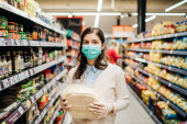 Zdjęcie "Kobieta chroniąca się przed wirusem korony lub COVID-19 podczas zakupów w supermarkecie. Ludzie w maskach i rękawiczkach. Środki bezpieczeństwa koronawirusów." może być wykorzystywane do celów osobistych i komercyjnych zgodnie z warunkami zakupionej licencji Royalty-free. Obraz jest dostępny do pobrania w jakości wysokiej rozdzielczości do 5760x3840.
