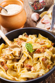 Pappardelle makaron z tuńczykiem, w sosie pomidorowym. Podawany na niebieskim talerzu, białe deski w tle. Widok z przodu.