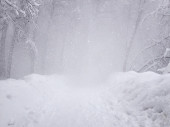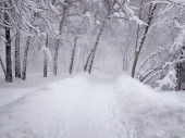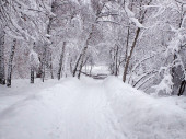 Mocno przyklejony śnieg na gałęziach drzew. Park w śnieżnej zimie.