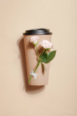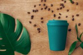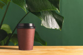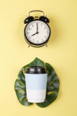 zabrać filiżankę na kawę lub herbatę na żółtym tle z zieloną gałązką palmową