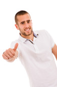 na białym tle uśmiechający się młody człowiek w niebieską koszulę i palcem wskazującym w górę.