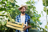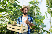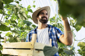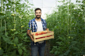 Portret młodego uśmiechniętego farmera ze świeżo zebranymi pomidorami i stojącego w ogrodzie szklarni. Produkcja żywności ekologicznej.