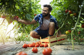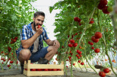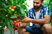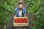 Zdjęcie "Portret młodego uśmiechniętego farmera ze świeżo zebranymi pomidorami i stojącego w ogrodzie szklarni. Produkcja żywności ekologicznej." może być wykorzystywane do celów osobistych i komercyjnych zgodnie z warunkami zakupionej licencji Royalty-free. Obraz jest dostępny do pobrania w jakości wysokiej rozdzielczości do 5760x3840.