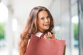 uśmiechnięta modna kobieta w białym swetrze i spódnicy w nowoczesnym salonie w słoneczny zimowy dzień patrząc wewnątrz torby na zakupy.