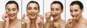 Kolaż azjatyckiej kobiety pozowanie z zielonym jabłkiem w dłoni i bliskiej twarzy izolowane na białym