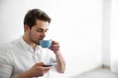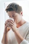 Selektywne skupienie się na młodym przedsiębiorcy trzymającym kubek kawy w biurze