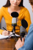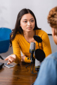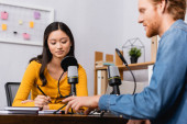 wybiórcze skupienie młodych nadawców azjatyckich pisanie w notatniku podczas wywiadu człowieka w studiu radiowym