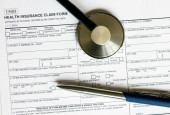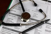 Formularz recepty leżący na stole ze stetoskopem i srebrnym wstrzykiwaczem. Koncepcja medycyny lub farmacji.