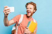 poziomy obraz rudej studentki trzymającej zeszyty i robiącej selfie na niebiesko