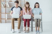 rudowłosa studentka trzymająca książki i korzystająca z tabletu cyfrowego obok blondynki z laptopem na niebiesko