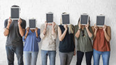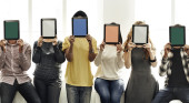 młodzi studenci zakrywający twarze trzymając tablety cyfrowe z czystym ekranem na niebiesko