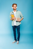 blondynka słuchanie muzyki w słuchawkach bezprzewodowych patrząc na studenta ze smartfonem na niebiesko