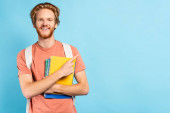 młody rudowłosy student trzyma papierową torbę i tosty chleb na niebiesko