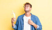 młody rudowłosy student z zamkniętymi oczami trzyma papierową torbę i tosty chleb na niebiesko