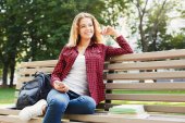 blondynka student w okulary gospodarstwa książki podczas siedzi na ławce