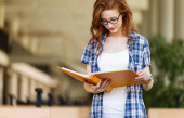 młody blondynka student w okulary gospodarstwa książki na zewnątrz