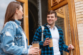 młodzi studenci w okularach z papierowymi kubkami, tabletem cyfrowym i książkami siedzącymi na ławce