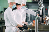 Dzień sanitarny w restauracji. Powtarza myć swoje miejsce pracy. Kuchenka, kuchenka i wyciąg w restauracji.