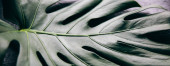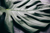 Koncentracja na liściach tropikalnych roślin, tekstura zielonych liści, liść monstera w doniczce na tarasie, Ogród w budynku, rosnący liść monstera