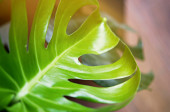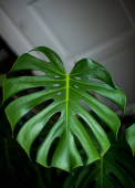 Koncentracja na liściach tropikalnych roślin, tekstura zielonych liści, liść monstera w doniczce na tarasie, Ogród w budynku, rosnący liść monstera