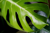 Koncentracja na liściach tropikalnych roślin, tekstura zielonych liści, liść monstera w doniczce na tarasie, Ogród w budynku, rosnący liść monstera
