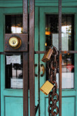 Metalowa kłódka na białych drewnianych drzwiach. Kłódka na drzwiach.